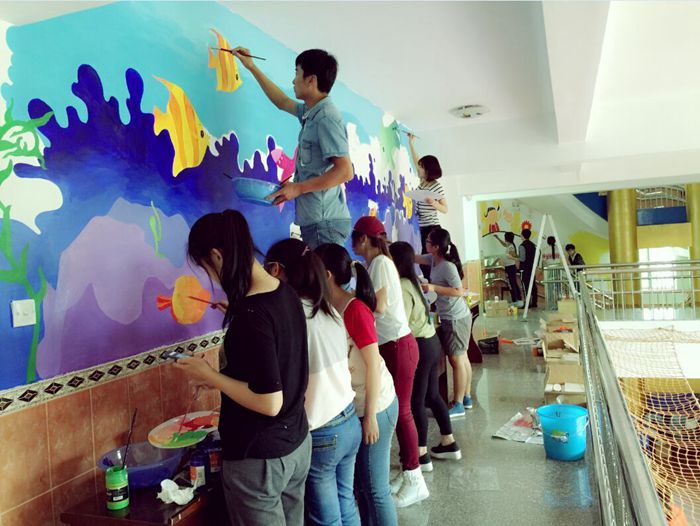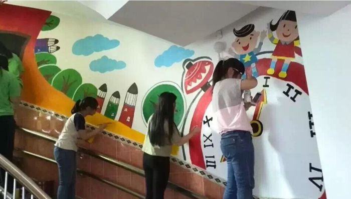 此次墙绘总长超过60米,面积约200平方米,装点了福利院大厅和每层楼梯墙面,内容包括海洋世界、美丽校园、快乐生活、浩瀚宇宙等主题。为在福利院生活的儿童美化了环境,也带领孩子们进入了一个个美丽的童话世界。学生们用双手、用创意装妆点了福利院孩子们的童年。