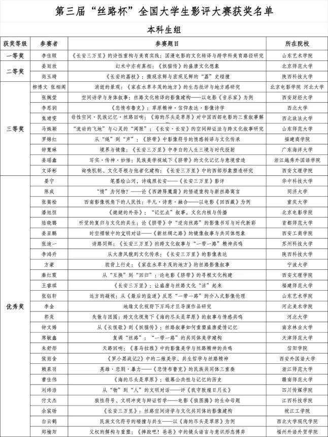 近日,第三届“丝路杯”全国大学生影评大赛评选结果正式揭晓。我校文学院戏剧影视文学专业学子荣获三等奖1项、优秀奖1项,专业教师马娜荣获“优秀指导教师”称号。